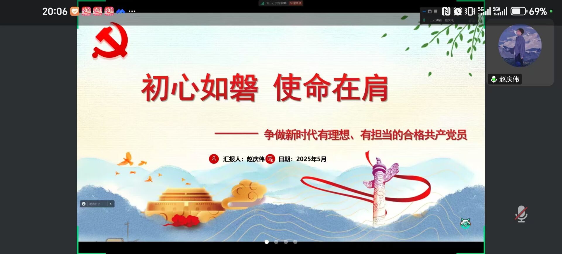 2024届西部计划志愿者、优秀共产党员赵庆伟为同学们作了《初心如磐 使命在肩》的优秀事迹分享,他从端正入党动机、大学生党员的使命担当及各阶段的成长路径三个方面展开分享,指出作为一名入党积极分子,应该德智体美劳全面发展,将“小我”融入“大我”,服务社会,奉献社会,处处以一名共产党员的标准严格要求自己。