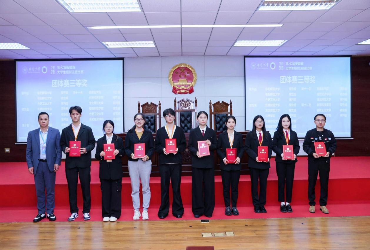 10月17日至19日,由安徽省教育厅主办、安徽大学承办的“2025年第七届安徽省大学生模拟法庭比赛”在紧张激烈的角逐中圆满收官。此次赛事吸引了全省20所开设法学专业的高校代表队踊跃参与。我校代表队凭借出色表现,在赛场上大放异彩,于原告组、被告组和审判组三个赛道同时斩获团体三等奖,这是我校在该项赛事中首次将多个团体奖项收入囊中,不仅彰显了我校代表队的实力,更凸显了团结协作的强大力量。