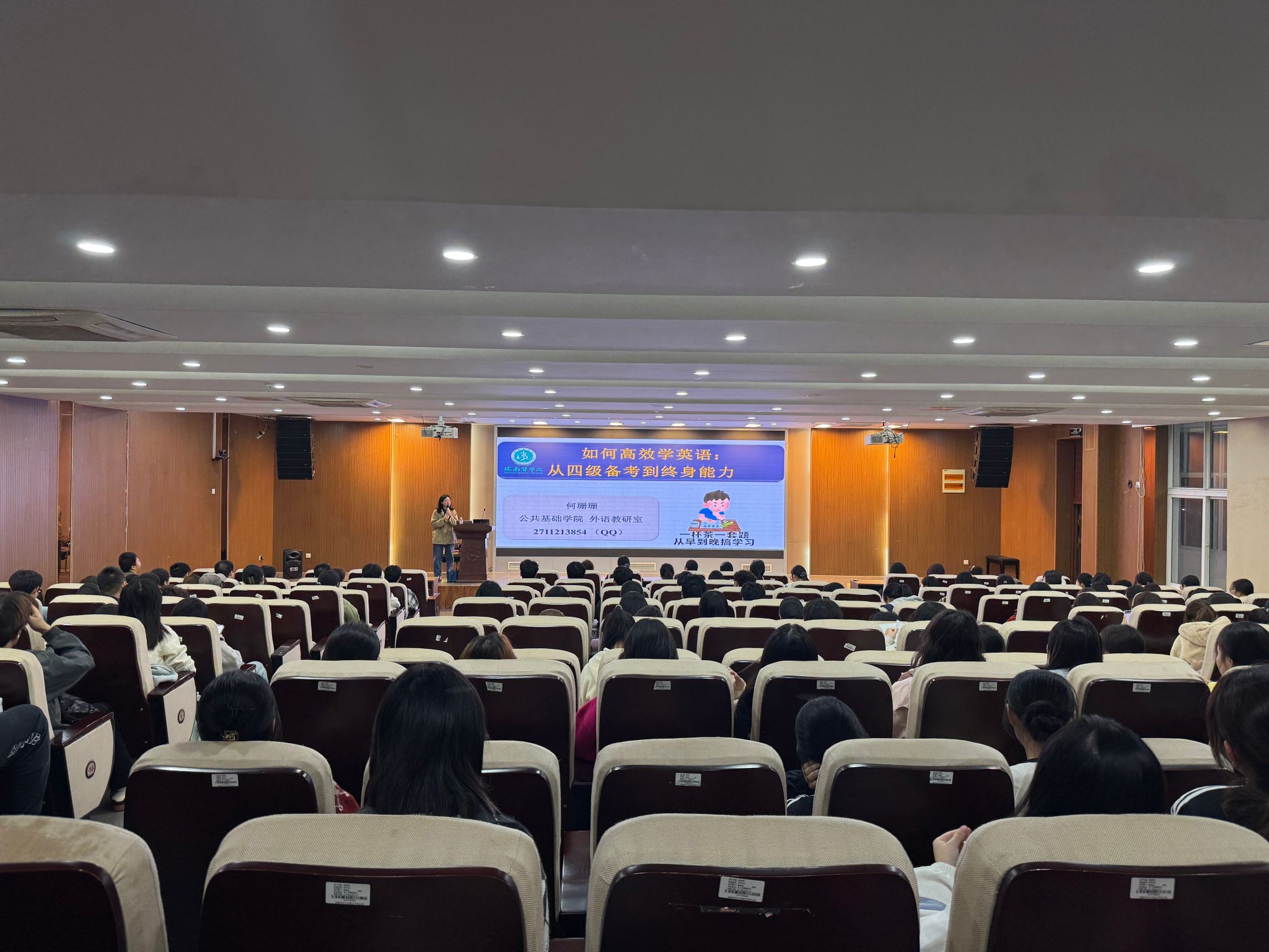11月6日晚,学院联合公共基础学院外语教研室,共同举办“如何高效学英语:从四级备考到终身能力”专题讲座。讲座中,何珊珊老师结合四级考试题型特点,从词汇记忆、听力训练、阅读技巧、写作模板等方面展开讲解,同时引导学生树立长期英语学习意识,将四级备考与终身英语能力提升相结合,帮助学生将备考困扰转化为应试底气。