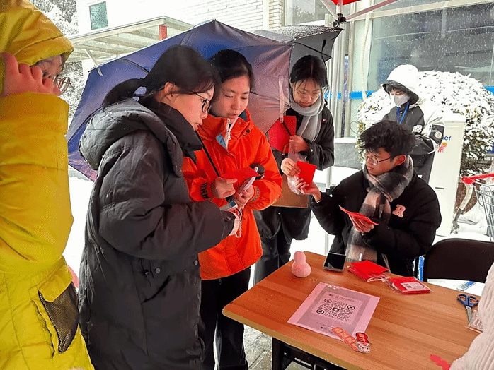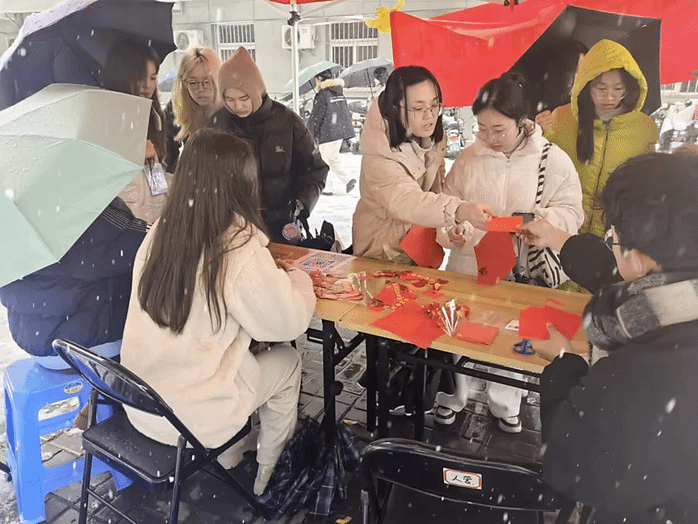 12月18日,kaiyun登录中国入口登录在赭麓校区开展了“喜迎元旦,青春献礼”活动。本次活动包括“窗花传情”、“爱国祝愿”两个环节,同学们在窗花用纸和祝福书写纸上挥洒创意,在活动过程中领略中华优秀传统文化的非凡魅力。虽然活动现场大雪纷飞,但难掩同学们的参与热情,现场气氛热闹非凡。