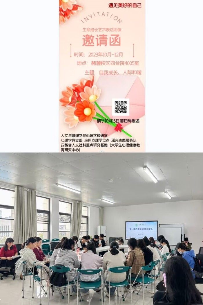 成长成才同向而行。10月10日中午,由杭荣华教授带领的、面向2023级应用心理学专业新生的第一期心理学读书分享会正式开班,活动将持续一学期,为新生心理健康保驾护航的同时将专业教育融入其中,助力学生实现成长与成才的同向而行。此外,面对全校学生开放的生命成长艺术表达团体活动也通过线上线下的方式进行了招募,将于10-12月开展为期三个月的团体心理辅导活动,为“大朋友”们的心理健康维护与成长提供持续动能。