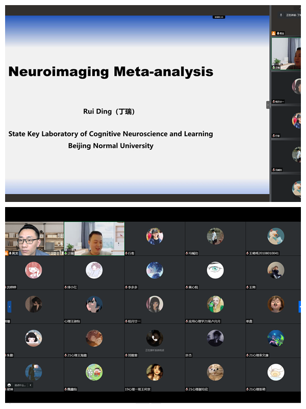 为落实“三全育人”理念,营造良好的学习氛围,激发学生的创新精神与实践能力。kaiyun登录中国入口登录于11月21日、27日分别举办两场“心青年”学术论坛。来自北京师范大学认知神经科学与学习国家重点实验室心理学博士后、我校2013级应用心理学专业硕士毕业生丁瑞和国家级实验教学示范中心博士李露分别作题为“Meta-analysis of neuroimaging data:introductions and tutorials”和“心理学研究设计与分析:中介、调节模型”的专题报告。心理学教研室专兼职教师、在校研究生、应用心理学专业全日制本科生和辅修专业学生以及“心青年”创新学习小组全体成员通过线上线下相结合的方式参加论坛,讲座由心理学教研室黄龙博士主持。