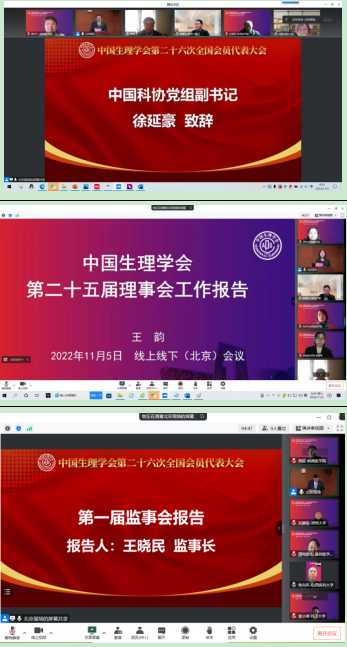 大会隆重开幕,中国科协党组副书记徐延豪热情致辞,第25届理事长王韵教授作《中国生理学会第二十五届理事会工作报告》,第一届监事长王晓民教授作《中国生理学会第一届监事会工作报告》。大会对第二十六届理事会理事候选人、第二届监事会监事候选人进行审议、无记名投票,选举出新一届理事和监事,我校张环环教授被顺利选举为中国生理学会第26届理事会理事,并出席中国生理学会第26届理事会第一次会议。汪萌芽教授被选举为中国生理学会第2届监事会监事,并出席中国生理学会第2届监事会第一次会议;同时出席中国生理学会第二十六届理事会常务理事党员扩大会议,参与了选举第二十六届理事会功能型党委委员等工作。