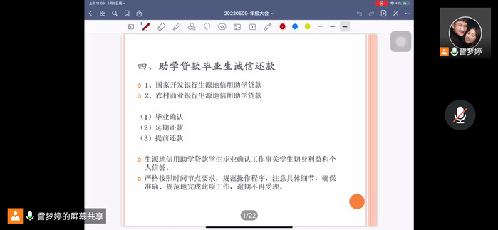 辅导员召开年级大会开展国家助学贷款毕业生诚信教育工作,详细介绍还款流程等政策要求,强调诚信还款的重要性,引导毕业生诚信、感恩、奋进、自励、自强的正能量。同时号召全体毕业生遵守防疫政策、做好自我规划、明确发展目标、积极参与社会工作,以饱满的热情投入到下一阶段的人生旅程。