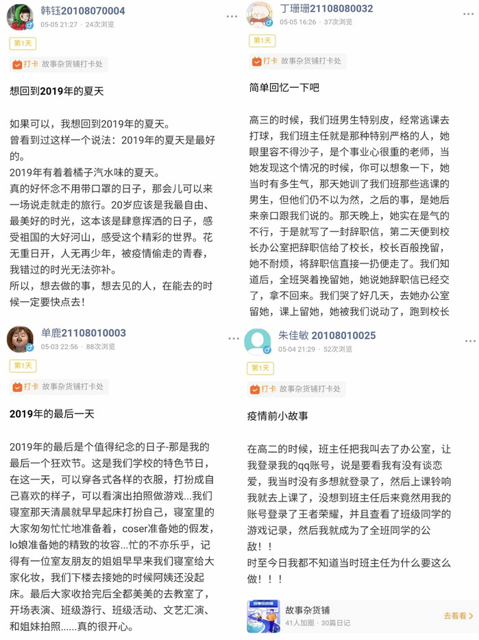 5月11日至13日,学院开展“故事杂货铺”活动,以文字寄情,启智润心。活动中,同学们依托线上平台分享和诉说疫情前的个人经历和对未来的憧憬、梦想,以文字、录音、视频等多种方式记录真实的青春故事,分享自己的所见所闻和所思所想,踏上一段探索心灵的旅程。