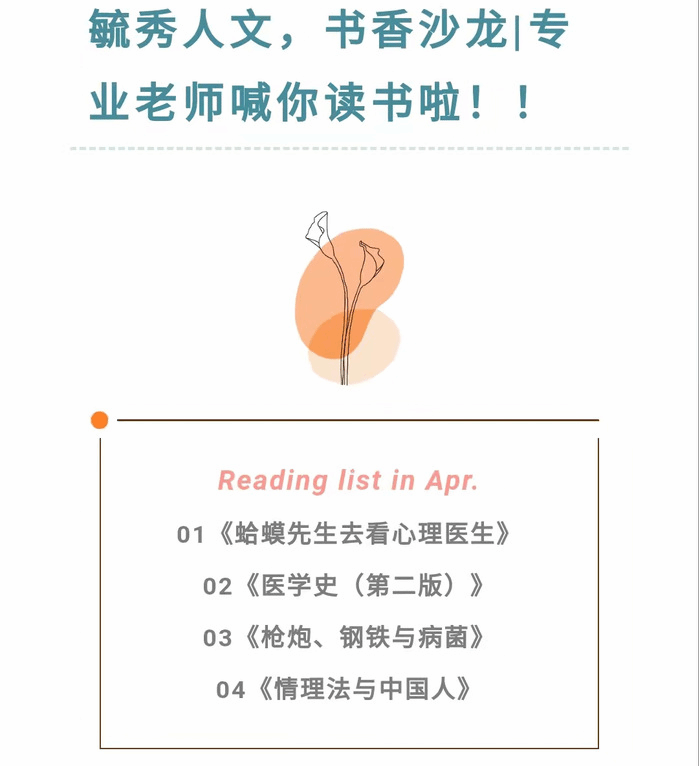 书香同沐,师生共读。四月读书月,学院开展“悦读·思享”师生共读活动,邀请保险学教研室主任俞彤、公共事业管理专业刘海荣老师、应用心理学教研室金鑫老师、法学教研室王翔老师,结合专业特色和学生阅读习惯精心为学子推荐数本专业课外读本。活动采取名师荐书,学生阅读、畅谈收获和所思所悟相结合的形式,旨在丰富专业知识储备、促进师生交流共享、互促共进的目的。