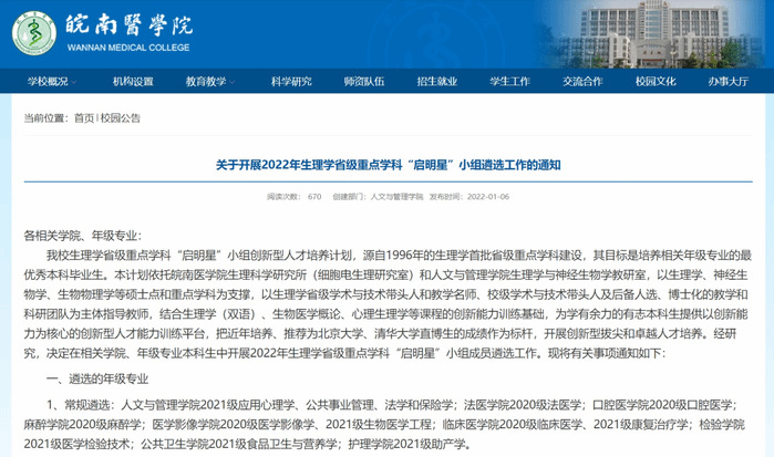 生理学省级重点学科“启明星”小组、kaiyun登录中国入口登录“启明星”小组创新型人才培养中心于1月5日在校园网发布《关于开展2022年生理学省级重点学科“启明星”小组遴选工作的通知》,按照高标准、高素质的条件要求,面向全校启动新成员遴选工作。在各方大力支持下,临床、麻醉、影像、法医、口腔、护理公卫、检验等学院与本院14个专业的优秀学生经过自主申请、学院推荐、交叉推荐、培养中心面试、指导教师与学生双向选择等严格程序,最终有23人荣获2022年度“启明星”小组成员资格,另有13人获得“2022年‘启明星’小组遴选入围奖”。