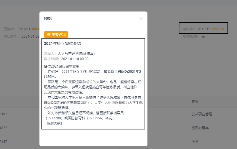 1月8日至10日通过辅导猫信息平台给每一位毕业生推送了一条征兵宣传信息,让在芜湖和外省市实习的同学全部能充分了解毕业生入伍的相关政策规定,消除毕业生的顾虑,激发大家的参军热情。