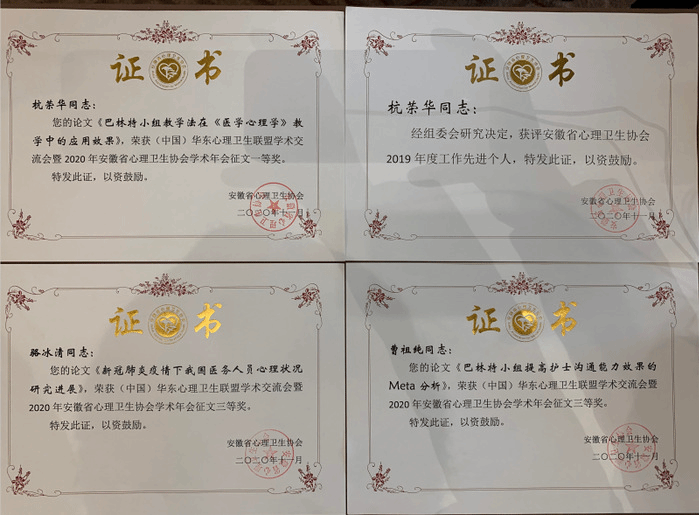 大会进行了年会学术论文的征集评选,我校杭荣华教授的论文《巴林特小组教学法在〈医学心理学〉教学中的应用研究》荣获一等奖,2018级应用心理学专业研究生曹祖纯的论文《巴林特小组提高护士沟通能力效果的Meta分析》和2020级应用心理学专业研究生骆冰清的论文《新冠肺炎疫情下我国医务人员心理状况研究进展》获三等奖。大会还对协会年度工作先进个人和先进集体进行了表彰,杭荣华教授获“安徽省心理卫生协会2019年度工作先进个人”称号。