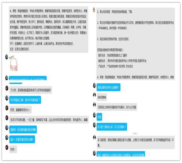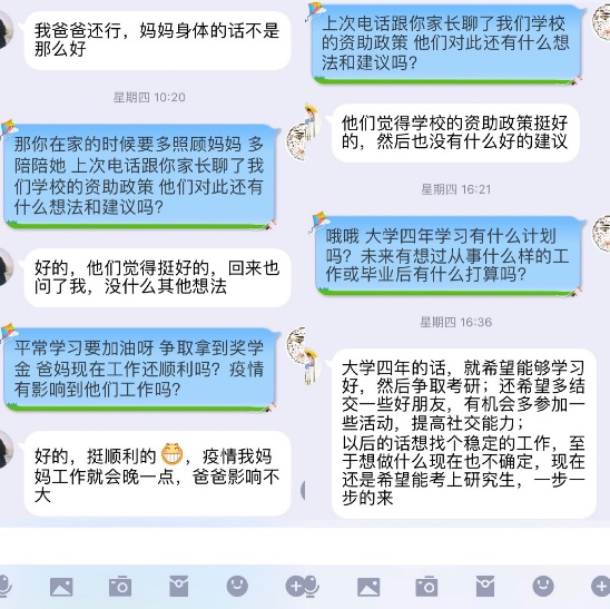 学院高度重视此次走访工作,走访前认真传达了学校的有关文件精神,把走访工作作为资助育人的重要过程。窦弘等人通过QQ、电话沟通的形式仔细询问学生暑期在家的学习、生活情况;了解了学生的家庭基本情况,同时宣传和解读了国家和学校的资助政策以及倾听学生和家长对此的看法和建议;最后鼓励学生要克服眼前的生活困难,保持积极乐观的心态,把握未来的发展方向。受访家庭对学校和老师们长期以来的关心和帮助表达了诚挚感谢,学生纷纷表示将不辜负学校和父母的期望,以优异成绩和实际行动回报母校和社会。