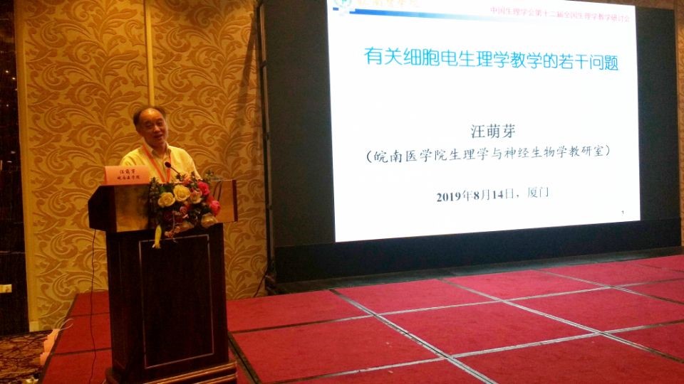 会上,我校生理学教学团队共提交会议论文摘要4篇,其中郑超老师的“创新理念始终贯穿生理学教学的实践与思考”被遴选为大会报告,报告指出在开展生理学特色教学、培养创新复合型人才中,我们积极响应国家号召、高度符合社会需要,引起与会者的广泛共鸣。汪萌芽老师的“以创新型人才培养为导向的实验室开放设计与实践”、张环环老师的“以生物-心理-社会医学模式为导向的《生物医学概论》课程建设初探”、徐爱萍老师的“面向普通医学院校医学影像学专业的生理学双语教学探索与实践”进行书面交流。同时,汪萌芽教授作为中国生理学会常务理事、人民卫生出版社《生理学》第9版教材的作者,应邀作了题为“有关细胞电生理学教学的若干问题”的大会报告。他紧密结合生理学教学难点,以及解决实际教学问题的解惑之道,进行了详细阐述。汪教授还作为特邀嘉宾在“生理学教学的今天和明天”的主题讨论中,提出了“不忘初心”——加强创新能力训练、“面向生命”——重视心理生理学培养以适应“生物-心理-社会医学”模式的创新型人才等观点,给在座的全国生理学教育工作者们以新的启迪。会议期间,汪萌芽还作为继任委员出席了新一届中国生理学会教育工作委员会会议、作为颁奖嘉宾为微课比赛获奖者颁奖。此外,我校生理学教学团队在暑期期间还应邀参加不同类型的教学交流活动。8月6日,汪萌芽教授应邀为“中国生理学会生理和行为学实验培训班”作了题为“脊髓运动神经元的细胞电生理技术与突触传递研究”的特邀专题报告,得到与会者的一致好评。