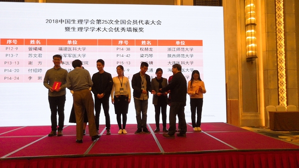 本次会议是中国生理学会历史上规模最大的一次全国大会,有参会代表1300多人。会议由复旦大学杨雄里院士主持首场大会报告,邀请到美国哈佛大学马秋富(Qiufu Ma)教授作冯德培纪念讲座,其中介绍了我校张艳老师在其实验室完成的博士后研究工作。另外还邀请到美国、芬兰等国家的多位知名学者作了大会报告。我校生理学团队的师生共提交17篇科研论文摘要,并被接受进行墙报交流。其中“启明星小组”成员展示了14篇英文墙报,并积极与专家、学者开展学术讨论,不仅充分展示了他们的创新训练成果,得到了许多专家的肯定,也进一步扩大了“启明星小组”的知名度和影响力,在会上产生了较大的影响。同时,在生理学教学方面,邵德翠老师也提交了“普通医学院校本科生理学翻转课堂式双语教学的探索”的论文摘要,并进行展示交流,多年多专业的教学研究成果得到专家的称赞,并获得优秀墙报奖。