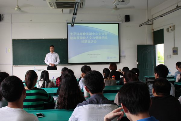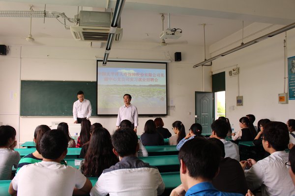 抓好实习助就业,实践育人谋未来。为切实做好实习、就业服务工作,5月6日上午,kaiyun登录中国入口登录于2206教室组织召开中国太平洋人寿保险有限公司芜湖市中心支公司实习、就业招聘宣讲会。邀请公司培训部讲师、门店项目负责人解钢进行招聘宣讲,kaiyun登录中国入口登录院长胡鸿、保险学教研室主任俞彤、学院秘书吴映辉、2013级辅导员张欣慧参会,2013级保险学专业全体学生和2012级部分毕业生到场参加并进行交流互动。会议由胡鸿主持。