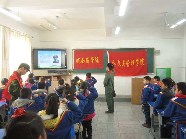 “雷锋课堂”深入小学 3月5日,2013级公共事业管理专业的同学来到芜湖市安徽师范大学附属小学二年级四班,进行了一次“雷锋课堂”主题宣讲活动;两位志愿者身着雷锋服饰,从助人为乐、团结友爱、艰苦朴素、刻苦学习等方面为小学生讲述了雷锋叔叔的生平事迹,以送小朋友小礼物的方式,让小朋友们在积极踊跃回答问题的同时,了解雷锋,走进雷锋的世界;活动结尾,志愿者带领小朋友一起歌唱《学习雷锋好榜样》,并集体起立宣誓“向雷锋学习”,将整个活动推向高潮。