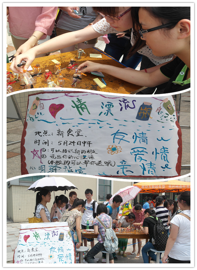 用青春拥抱时代,在五月心理健康月中,人文与管理系“心明驿站”在心理教研室刘新民教授、何苗苗和范佳丽老师的指导下,开展了以“中国梦・你我心・皖医情”为主题的积极心理健康普及活动。 心情漂流瓶,传递积极心理正能量。5月24日午时,人文与管理系“心明驿站”在新食堂开展了“积极心理正能量,心情漂流瓶”活动。活动中,同学们热情参与,纷纷以书面的形式表达了自己的心情、思想以及积极的生活态度,展示了当代大学生对自由、希望和友谊的感知能力,面对挫折不屈不饶的战斗力。每一个漂流瓶都向我们传递着心理正能量,鼓舞着我们乐观向上,积极进取。
