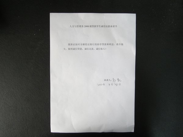 随后,吴映辉老师和每位贷款学生签订了诚信还款承诺书,每位同学都郑重许下了“诚信贷款、诚信还款、诚信做人”的诺言。