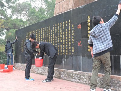 上午8时,活动正式开始。全体志愿者肃立,在烈士纪念碑前默哀三分钟,向为革命事业付出鲜血的烈士们表达最崇高的敬意。接下来同学们在烈士墓前庄严地举起右手,重温入团誓词。在“我志愿加入中国共产主义青年团”的宣誓声中同学们心潮起伏,思绪万千。宣誓结束后,志愿者们不仅认真地清洁了烈士墓碑,还仔细地清理了烈士陵园广场上的废物与杂草,为伟大的革命烈士们留下一片长眠的净土。