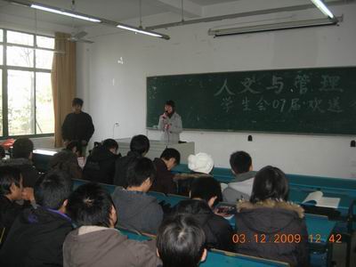 12月3日中午,西教104教室内欢声笑语,人文与管理系07、08、09级学生会成员齐聚一堂,举办“人文与管理系07级学生会成员欢送会”。学生会主席魏林峰主持会议,团总支书记吴映辉老师出席会议。