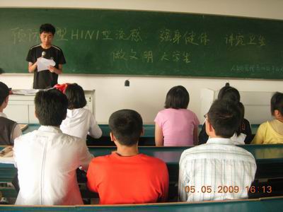 5月5日下午,人文与管理系08级学生在西503教室开展了“全面预防甲型H1N1型流感、强身健体、讲究卫生、做文明大学生”活动。