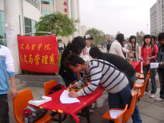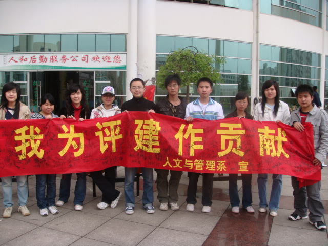 4月9日,人文与管理系团总支学生会在学生食堂门口举办了以“关心评建 参与评建 我为评建作贡献”为主题的签名倡议活动。