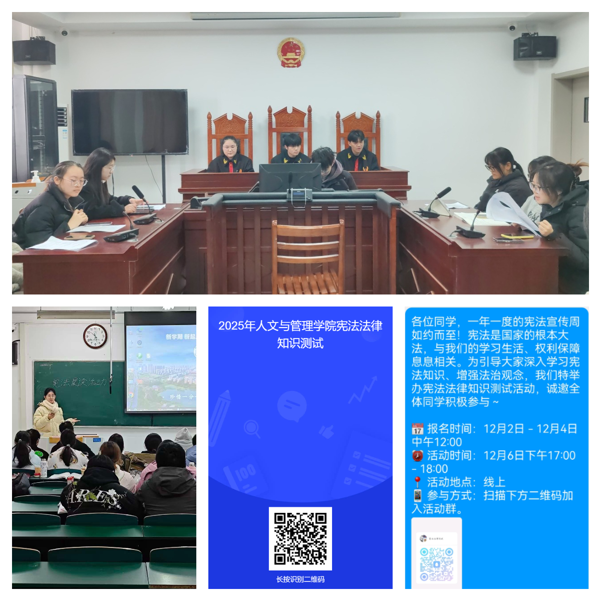 12月5日,学院举办大学生模拟法庭审判活动,该审判围绕“从35周岁到38周岁——公务员报考年龄调整的宪法分析”这一主题展开,原告方与被告方围绕公务员报考年龄限制规定是否侵犯公民平等权与劳动权这一议题,展开激烈辩论。通过沉浸式、观摩式的“模拟法庭”活动,让学生切身感受法律的威严,提升学法、知法、懂法的能力。此外,kaiyun登录中国入口登录组织宪法法律知识测试以及共度一段“宪法晨读”时光活动,有效深化广大师生对宪法精神的理解,夯实了宪法知识储备,筑牢了宪法知识根基,提升了宪法实践素养。
