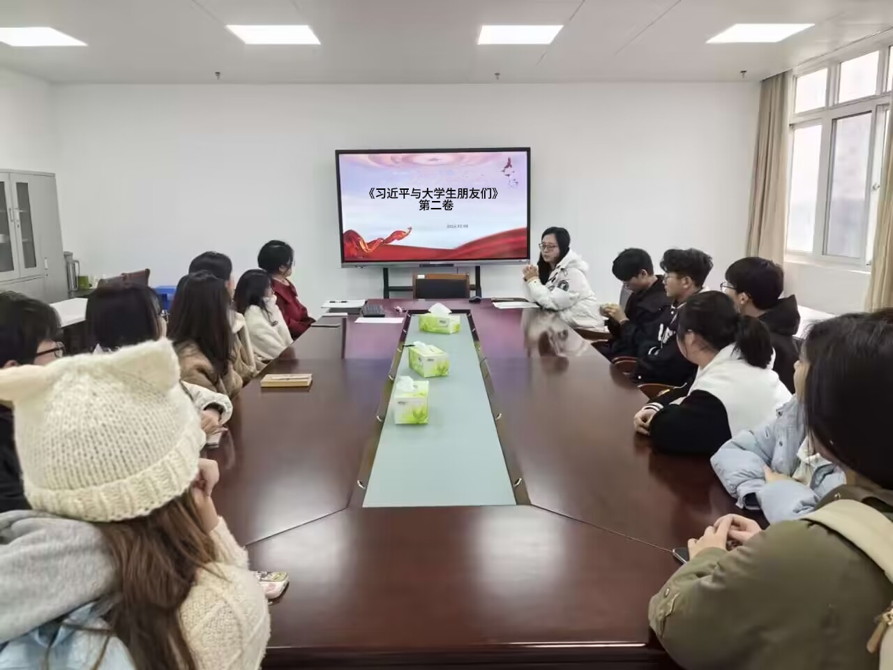 《习近平与大学生朋友们》第二卷通过24篇访谈实录讲述了习近平同志在中央和地方工作期间,深入高校调研考察、关心指导大学生的生动故事。张露在读书会上,号召广大青年深刻领悟习近平总书记关于青年工作的重要思想和关于教育的重要论述的形成过程和发展脉络,准确把握党的创新理论的世界观方法论,更加深刻领悟“两个确立”的决定性意义,不断增强“四个意识”、坚定“四个自信”、做到“两个维护”,践行“两个确立”。读书分享阶段,同学们表示将深刻领会习近平总书记指引的青春航向,时刻牢记党和人民的殷切期待,争做有理想、敢担当、能吃苦、肯奋斗的新时代好青年。